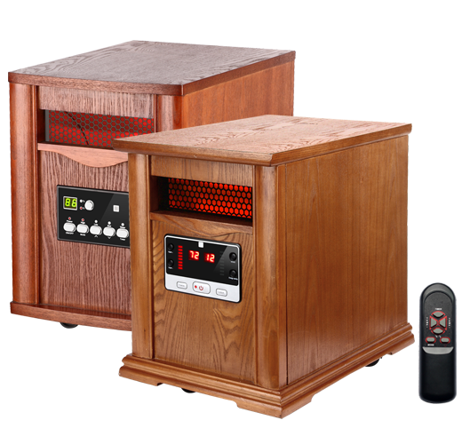 Quartz Infrared Heater Energy saving Auto ModeLow setting: 1000W High setting: 1500WFront Panel Push Button Controls LCD display Remote ControlUses infrared quartz tubeWooden CabineUses conventional 120V 3 prong outletHeight: 16.5" Width: 11.4" Depth: 15.7"   Height: 42cm Width: 29cm Depth:40cm   Electric Cord 71" (180.34cm)long, Rated at approximately 5200 BTU   Amps: 12.5 Watts: 1500 Listed by cETLus   The wooden cabinet appearance can be designed by customer